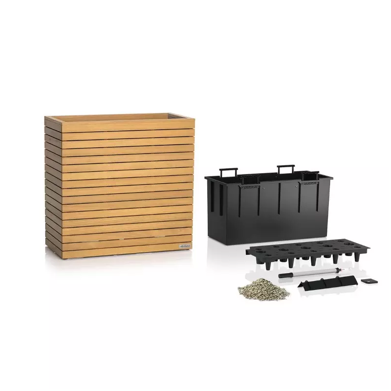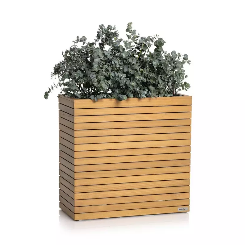 Το PALO Natural Wood είναι κάτι περισσότερο από μια απλή ζαρντινιέρα - είναι μια αποκλειστική δήλωση για το σπίτι ή τον κήπο. Κατασκευασμένο από μασίφ ξύλο ευκαλύπτου, το PALO Natural Wood παρουσιάζεται ως σχέδιο υψηλής ποιότητας. Η λαδωμένη επιφάνεια από πραγματικό ξύλο αναδεικνύει τέλεια τον χαρακτήρα του υλικού, τονίζει τους κόκκους και δίνει στην επιφάνεια μια ματ λάμψη σε σκόνη. Με την ευέλικτη επιλογή μεγεθών και σχημάτων, είτε ως στήλη, κύβος ή διαχωριστικό δωματίου, η ζαρντινιέρα προσφέρει έναν κομψό τρόπο προβολής φυτών. Η ζαρντινιέρα δεν εντυπωσιάζει μόνο με την αισθητική της εμφάνιση, αλλά και με τις βιώσιμες ιδιότητές της. Αυτό συμβαίνει επειδή το ξύλο ευκαλύπτου της ζαρντινιέρας είναι πιστοποιημένο με FSC® ("Forest Stewardship Council®"), το οποίο εγγυάται τη βιώσιμη δασοκομία. Στο εσωτερικό της ζαρντινιέρας υπάρχει ένα αφαιρούμενο ένθετο φυτού με αναδιπλούμενες λαβές από ανακυκλωμένο πλαστικό. Αυτό καθιστά τη φύτευση και τη συντήρηση ιδιαίτερα εύκολη, ενώ το αρχικό σύστημα άρδευσης LECHUZA εγγυάται ότι τα φυτά λαμβάνουν ακριβώς τη σωστή ποσότητα νερού. Το PALO μπορεί να συμπληρωθεί με ασορτί σουβέρ.